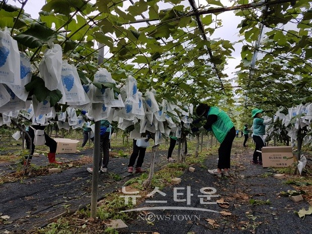 이날 무더운 날씨에도 조순호 부녀회장을 비롯한 15명의 회원들은 오전 7시부터 2483㎡ 면적의 포도밭에서 12,000여 개의 포도송이에 봉지를 씌우는 작업으로 관내 어려운 포도농가에 일손을 도왔다.