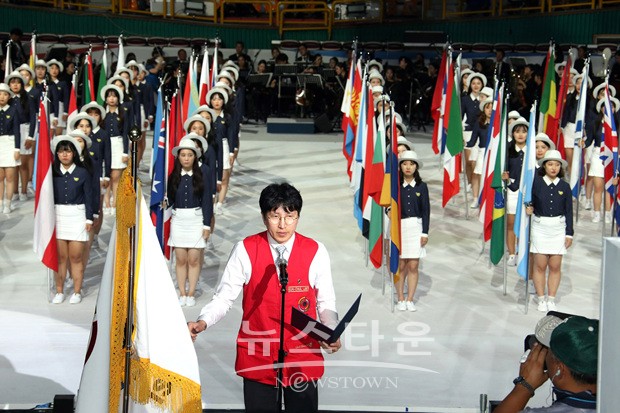 국제사격연맹가가 울려퍼지는 가운데 해군의장대가 국제사격연맹기를 들고 입장했다. 김종현, 정미라 선수의 선수대표 선서와 이은철 심판의 심판대표 선서 후 ‘평화, 또 다른 시작’을 주제로 주제공연이 시작됐다.