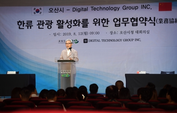 곽상욱 오산시장은 12일 오산시청 대회의실에서 글로벌 금융·관광서비스 제공 전문 기업인 디지털테크놀로지그룹(DIGITAL TECHNOLOGY GROUP INC.) 왕루이 이사 일행과 한류관광 활성화를 위한 협약(MOU)을 체결했다.