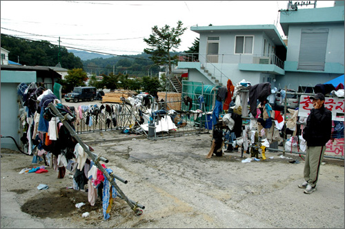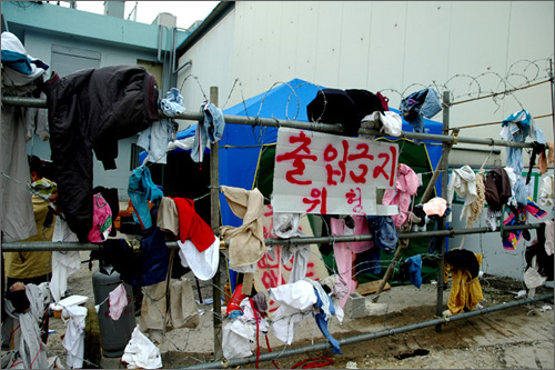| ^^^▲ 원주도축장 문제 집단폭력으로 번져출입문 봉쇄 바리케이트에는 철조망과 석유를 뿌린 옷가지가 걸려있다. 비상시 옷에 불을 붙여 출입자들을 제지하기 위한 수단이라고 한다. ⓒ 뉴스타운 김종선^^^ | ||