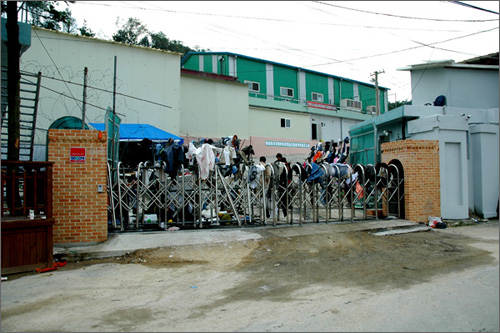 | ^^^▲ 원주도축장 문제 집단폭력으로 번져 유치권자인 퓨넥스관계자들이 낙찰자관계자의 출입을 막기위하여 바리케이트를 치고 정문을 봉쇄한후 바리케이트위에 석유를 뿌린 옷가지들을 걸어놓고 출입문을 지키고있다. ⓒ 뉴스타운 김종선^^^ | ||