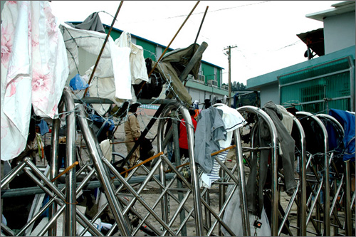 | ^^^▲ 원주도축장 문제 집단폭력으로 번져외지인의 출입을 봉쇄하기 위하여 바리케이트에 철조망과 석유를 뿌린 옷가지를 걸어놓고있다. ⓒ 뉴스타운 김종선^^^ | ||