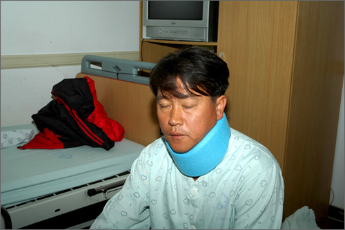 | ^^^▲ 원주도축장 문제 집단폭력으로 번져병원에 입원중인 피해자, 목이 휘어지는 피해를 입었다. ⓒ 뉴스타운 김종선^^^ | ||