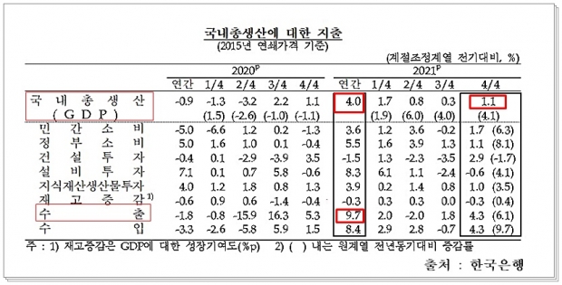 한국은행은 25일 2021년도 4분기 실질 국내총생산(GDP) 성장률(속보치)이 1.1%로 집계 됐고, 연간으로는 전년 대비 4.0%의 성장률을 보였다고 발표했다.