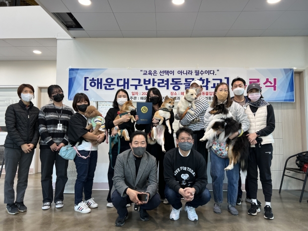 해운대구(청장 김성수) 일자리경제과 동물복지팀 주관으로 해운대구유기동물입양센터에서 부산경상대 반려동물교육문화센터 (센터장 최동락)교육위탁 운영으로 개강한 해운대구반려동물학교 1기 반려인과정 15팀 17명이 지난 5일 수료식을 했다.