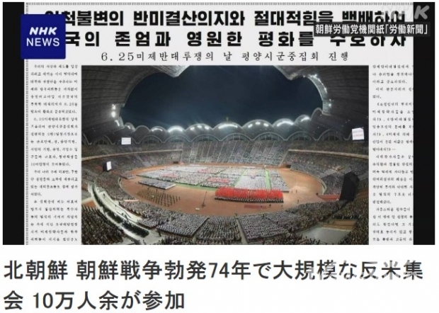 26일자 북한의 조선노동당 기관지 '노동신문'은 조선전쟁 발발 74년 만에 '반미투쟁의 날'로 여겨지는 25일 수도 평양 경기장에서 대규모 반미집회가 열렸다. 노동자, 학생 등 10만여 명이 참가했다고 신문이 보도했다고 일본 NHK방송이 보도했다.