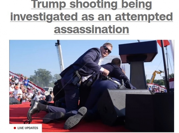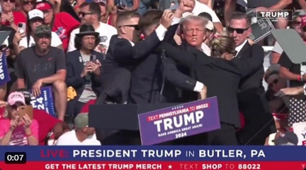 미국 공화당 대통령 후보 도널드 J. 트럼프 전 대통령이 펜실베이니아 버틀러에서 가진 유세장에서 연설 도중 한 남성의 총격으로 오른쪽 귀 위쪽을 관통, 피를 흘렸다고 CNN, BBC 등 이 일제히 보도했다.