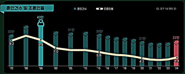 혼외 출산이 드문 한국에서는 결혼과 출산 간의 연관성이 여전히 강하다. 데이터에 따르면, 남성이 처음 결혼하는 연령은 2024년에 33.9세였고, 여성은 31.6세였다. 인구 통계 연구에 따르면 부부가 일찍 결혼할수록 여러 자녀를 가질 가능성이 더 높다.