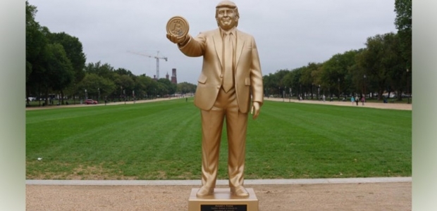 미국 국회의사당 밖에 12피트(약 3.6m) 높이의 황금색 도널드 트럼프 대통령이 오른손에 비트코인을 잡고있는 모습의 동상이 공개돼, 논쟁을 불러일으키고 있다.