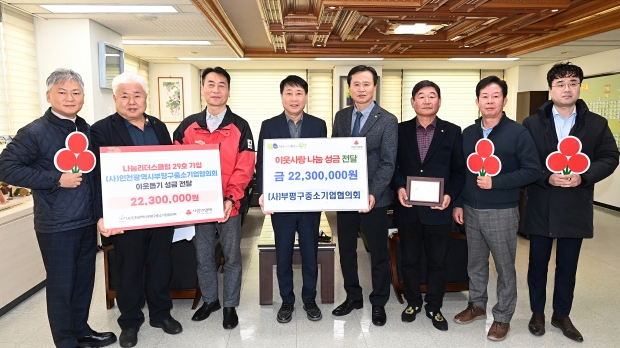 인천 부평구는 29일 경제단체인 사단법인 부평구중소기업협의회로부터 연말 이웃사랑 나눔 성금 2천230만원을 전달받았다. 전달된 성금은 사회복지공동모금회를 통해 지역 내 어려운 이웃에게 전달될 예정이다.