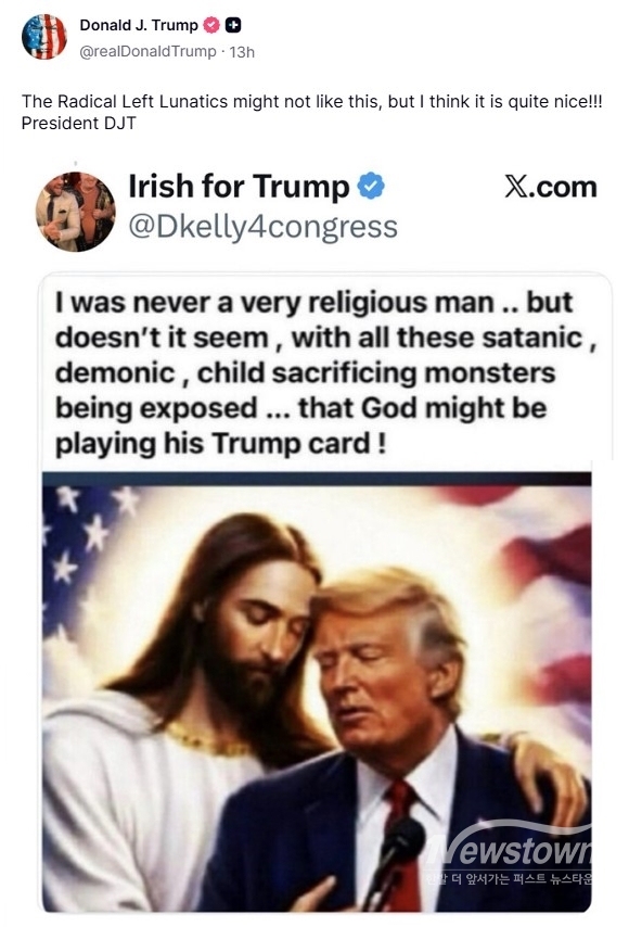 앞서 트럼프 대통령은 지난 12일 트럼프 대통령은 자신이 예수 그리스도와 같은 성인적인 능력(saint-like powers akin to those of Jesus Christ)을 지녔음을 암시하는 그림을 게시했다.