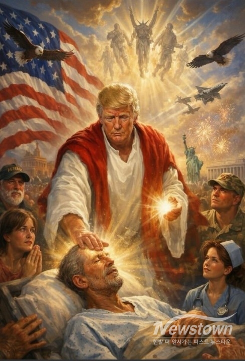 성경 속 인물처럼 옷을 입은 트럼프가 병상에 누워 있는 남성에게 손을 얹고 있는 모습에서 그의 손가락에서 빛이 뿜어져 나오고, 군인, 간호사, 기도하는 여성, 야구 모자를 쓴 수염 난 남성이 감탄하며 바라보고 있다. 하늘에는 독수리, 미국 국기, 그리고 희미한 안개 같은 형상들이 가득한 이미지를 올렸었다.