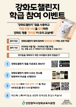 교육지원청은 모바일 앱 ‘강화도챌린지’를 활용한 1분기 참여 이벤트를 4월부터 5월까지 운영한다고 밝혔다.
