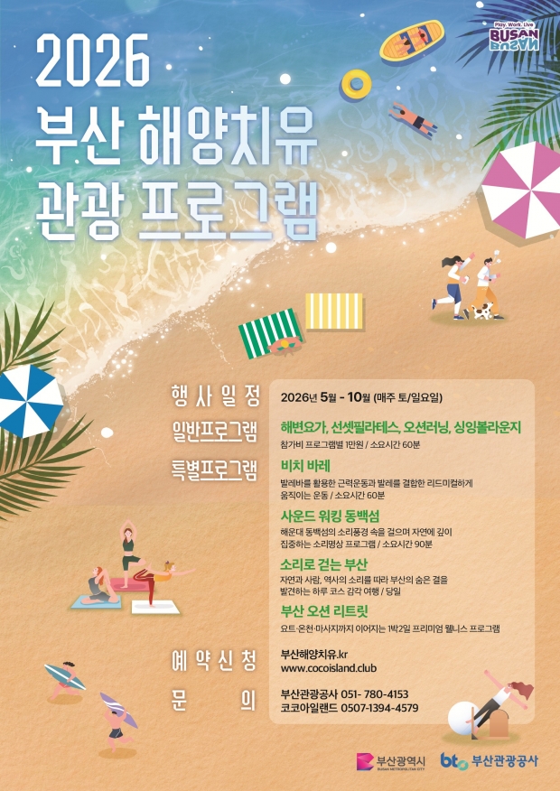 부산관광공사 관계자는 “부산 해양치유 관광 프로그램은 누구나 바다를 통해 일상 속 회복을 경험할 수 있도록 기획된 콘텐츠”라며 “올해는 체류형 관광과 감각 중심 프로그램을 강화해 새로운 관광 매력을 제공할 계획”이라고 설명했다.