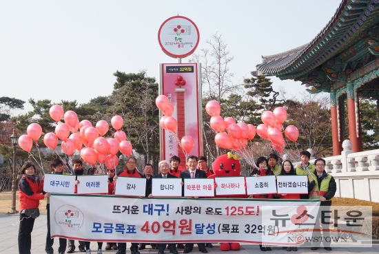 대구공동모금회는 2011년 12월 1일부터 진행중인 희망2012나눔캠페인의 모금액이 1월 31일(화) 기준으로 40억1천만원인 역대최고액을 기록하며 사랑의 행복온도탑이 125도를 넘어섰다고 밝히고,