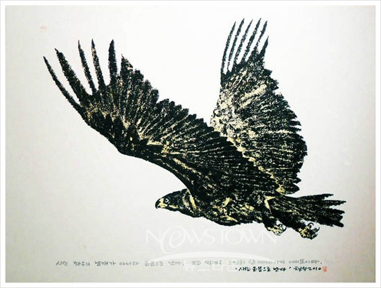 한국민족예술단체총연합 대구지회, 예술마당솔, 대구경북전문직단체협의회는 오는 29일까지 봉산문화회관 전시실에서 이철수 목판화 30년 대구전시 ‘새는 온몸으로 난다’를 열고 있다.