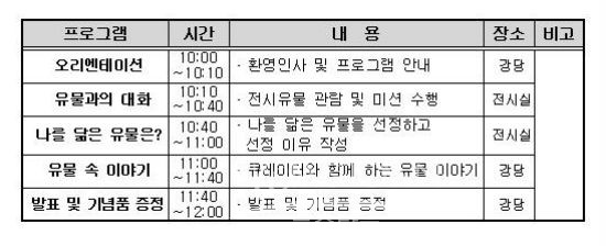 프로그램 내용은 박물관 전시유물을 감상하면서 자기주도적으로 활동지를 풀어보는 ‘유물과의 대화’, 전시유물 중 자기와 가장 닮은 유물을 선정하고 그 선정 이유를 작성하는 ‘나를 닮은 유물은?’, 큐레이터와 함께 그 유물의 의미를 알아보고 토론하는 ‘큐레이터와의 대화’, 그리고 ‘발표 및 기념품 증정’ 등으로 이루어졌다.