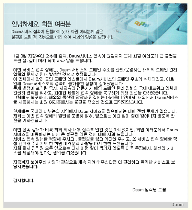 국내에서 가장 많은 사용자를 확보하고 있는 메일 호스팅 업체인 다음(www.daum.net)의 서비스가 1월 8일 자정부터 오후에 이르기 까지, 접속이 원활하지 않았다.