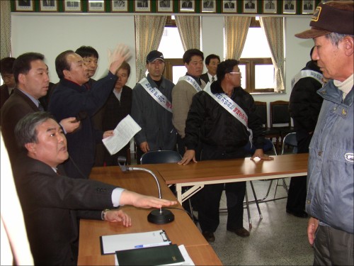| ^^^▲ '군수님 모셔와라'함덕주민대책위 35명이 16일 오후 함덕포구 매립지 매각 반대와 관련 북제주군청 3층 회의실에서 의견을 교환했으나 결론에 이르지 못했다. ⓒ 김병관^^^ | ||