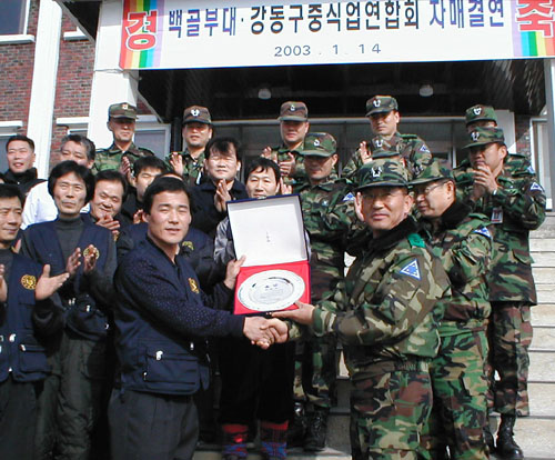 | ▲ 백골부대장과 서울 강동구 중식업 연합회 정관훈 회장이 자매결연패를 교환하며 환하게 웃고 있다. | ||