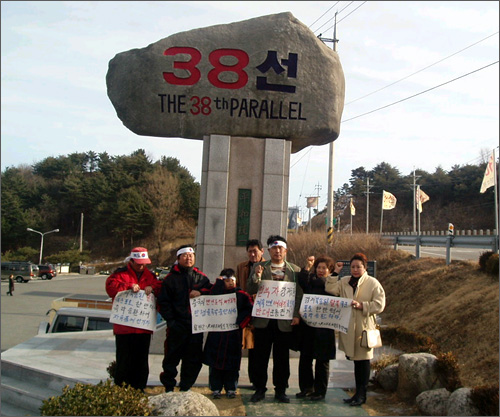 | ^^^▲ 강원양양군현북면 38선기념비앞에서 코리아독도녹색연합, 활빈단 회원들이 강제북송된 탈북국군포로 한만택씨 송환을 촉구하고 있다. ⓒ 코리아독도녹색연합^^^ | ||