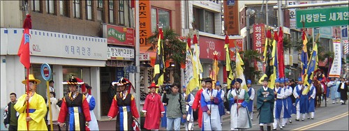 ^^^▲ 제주목사도임행차 모습사진은 22일 제주목관아지 복원 준공식에 앞서 시민과학생 등 320여명이 제주시청을 출발하여 중앙로를 거쳐 제주목관아지광장까지 제주목사 도임행차를벌이고 있다
