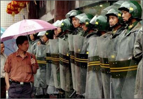 | ^^^▲ 길가던 학생을 친 승용차 주인과 학생간의 다툼이 시위로 번진 안휘성 시조우시의 시위 진압 공안원(경찰)이 진을 치고 있다. ⓒ Reuters^^^ | ||