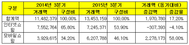 특히 최근 인터넷쇼핑몰의 고성장요인으로는 모바일쇼핑의 확산과 오프라인 유통기업의 온라인몰 강화가 큰 영향을 끼치는 것으로 분석된다. 판매매체별 거래액 비교시 2014년 3분기 모바일 쇼핑의 거래액은 3조 9296억원으로 전체 온라인쇼핑몰 거래액의 34.2%였으나 2015년 3분기에는 6조 2078억원으로 전체 온라인쇼핑몰 거래액의 46.1%까지 큰폭으로 성장하였다.