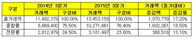 2015년 3분기 [온라인쇼핑몰 취급상품 범위별 거래액]은 전년 동기 대비하여, 전문몰은 13.1%, 종합몰은 18.5% 증가하였다. 2015년 3분기 [온라인쇼핑몰 운영형태별 거래액]은 전년동기 대비하여 Online몰은 17.5%, On/Offline몰은 16.5% 증가하였다.