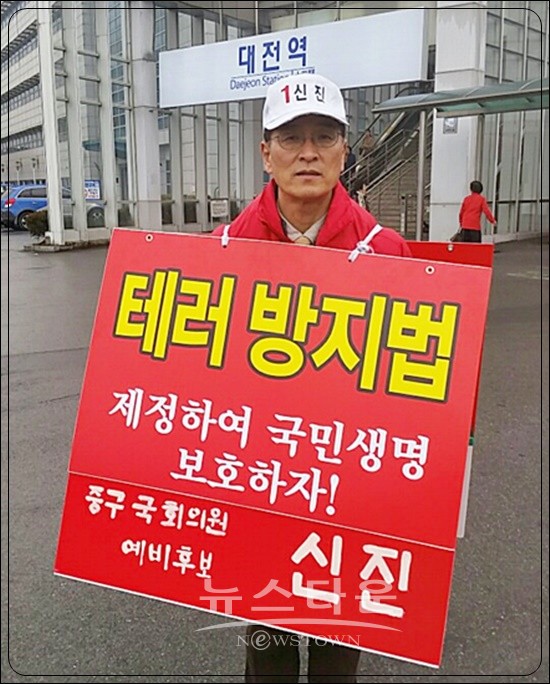 대전 중구에 새누리당 예비후보로 등록한 신 진(58, 충남대교수, 대전 중구)후보가 테러방지법과 관련하여 대전역 광장 및 옛 충남도청 앞에서 1인 시위를 벌이고 있어 주목을 받고 있다.