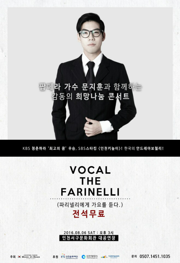 오는 29일 인천중구문화회관과 8월 6일 인천서구문화회관에서 개최되는 이번 공연은 ‘파리넬리에게 가요를 듣는다’라는 주제로 테너 문지훈의 다양한 레파토리가 펼쳐질 예정이며, 지역 협력형 공연 사업으로 선정되어 인천시, 인천문화재단, 한국문화예술위원회의 후원으로 전석 무료관람으로 진행된다. 이달 열린 지난 1, 2회차 공연이 이미 많은 관객들의 호응을 얻은 만큼 남은 공연도 성황리에 개최될 것으로 예견되고 있다.