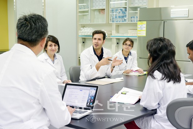 ▲ 순천향의생명연구원에서 해외 9개국 학생들이 교수들과 함께 연구프로젝트에 대한 토론수업을 진행하고 있다, ⓒ뉴스타운