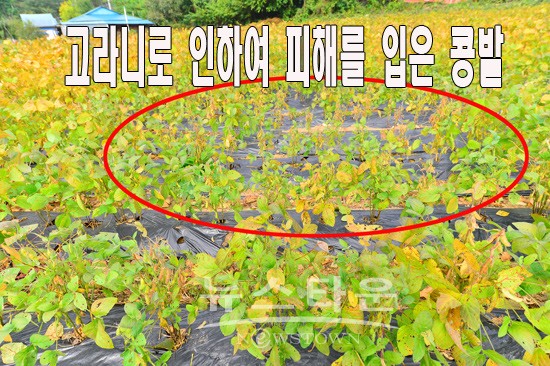 고라니의 피해를 막기 위해 쳐 놓은 그물막이 뚫어져 고라니가 콩을 뜯어 먹어 수확이 1/3로 감소 할 것이라는 농민의 울상이다.