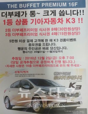그 한 예가 현재 '더부페 불광점(NC백화점 16층)'에서 지난 9월1일부터 오는 11월 30일까지 진행하고 있는 '기아자동차 K3 경품이벤트’다. '더 부페가 통 크게 쏩니다!!'라는 슬로건으로 추진하고 있는 이번 이벤트는 단순히 손님을 끌어들이기 위한 것이 아니다.