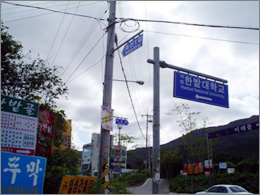 또한 도로를 따라 가다 보면 교차로를 만날 수가 있는데, 교차로에 이르기 수m 전에 아래 사진과 같은 도로명판을 이용한 교통표지판이 설치되어 있는 것을 종종 볼 수가 있다.