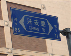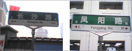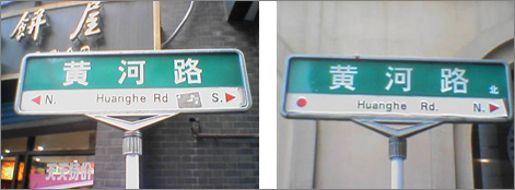 중국의 도로명판에는 아래 그림에서 보는 것처럼 중국어 표기 하단에 영어로 표시해 외국인들에게 편이를 제공하고 도로의 방향을 동서남북(EWSN) 4단계로 구분하여 함께 표시하고 있다는 것을 알 수 있다.