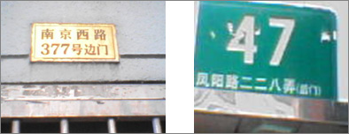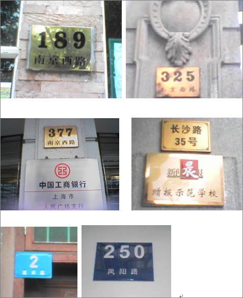 중국 상해의 거의 모든 건물에는 건물번호판이 부착되어 있는 것을 볼 수 있다. 대부분의 건물번호판은 일정한 형식을 따르고 있으나 아래 사진들처럼 다양한 형태를 띠고 있는 것을 볼 수 있다.