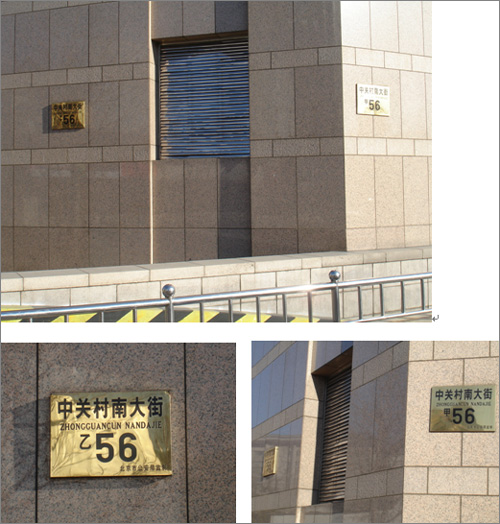 또한 공공기관이나 예외 없이 건물번호 주소를 표기하고 있는데, 아래 사진은 동양의 진주라고 불리는 [동방명주]의 모습과 ‘세기대도1’이라고 표시된 주소표시판이 부착된 조형물을 보여 준다.