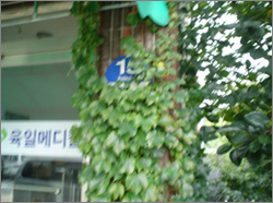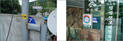 아래 사진들은 기둥이나 간판 등의 부착물이나 식물 등에 의한 건물번호판의 훼손 및 방치 사례를 보여 준다.