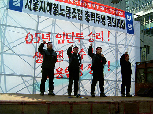 지난 15일부터 3일간 실시한 조합원 찬반투표에서 67.2%의 찬성으로 파업을 결의한 서울지하철노조는 21일 서울시청 앞에서 조합원 2,000여명이 참석한 가운데 ‘총파업 승리 결의대회’를 열고 △주5일제 시행과 관련한 근무형태 개악 기도 철회 △현장인력 확충 등을 서울시와 지하철공사 측에 촉구했다.