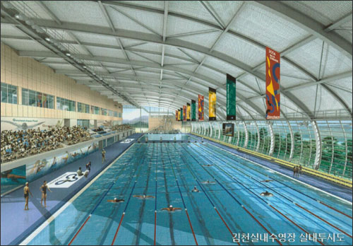 전국체전기간 중 수영 전종목 경기가 펼쳐지는 김천실내수영장은 연면적 3,800평, 지상3층, 지하1층 규모에 1,500석의 관중석을 갖추고 있으며 또한, 철골철근콘크리트 구조에 외부를 단열판넬과 복층유리로 마감함으로써 마치 예술작품 같아 보이는 실내수영장은 주위 자연환경과 잘 어울리는 모습으로 개장 후에는 새로운 명소로 각광받을 전망이다.