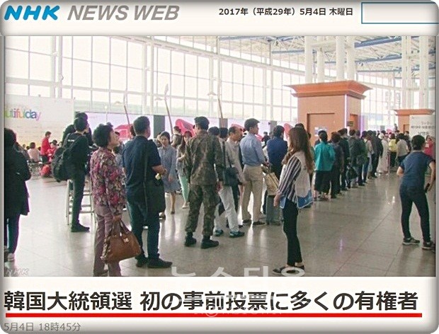 일본의 공영 방송인 NHK가 4일 오는 9일에 치러지는 한국의 대통령선거를 앞두고 대선 투표에서는 처음으로 실시하는 사전투표 첫날 풍경을 관심 있게 보도했다.