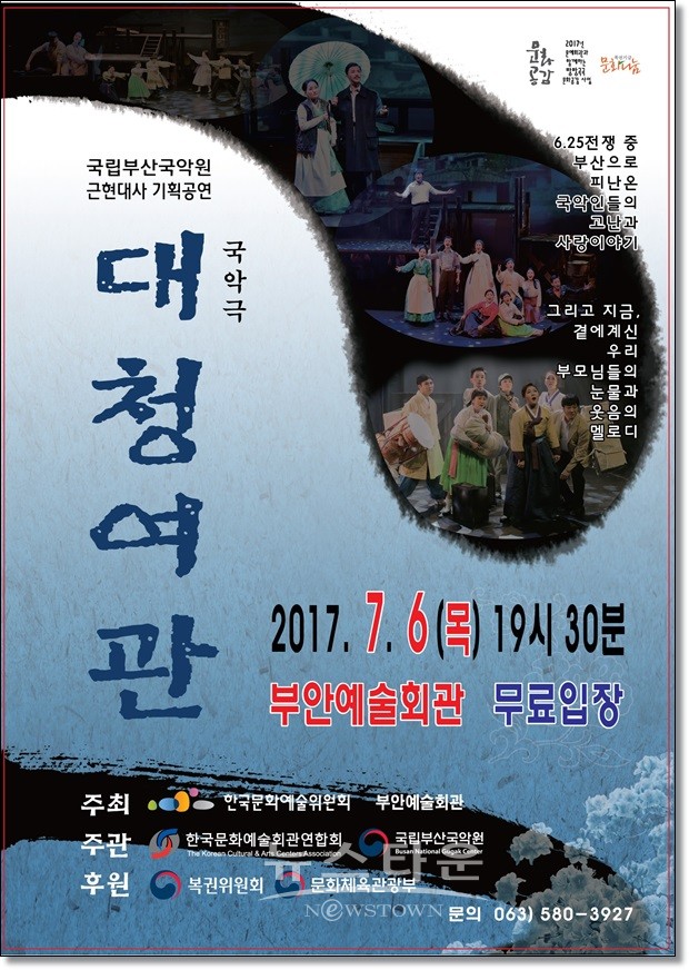 국립부산국악원의 국악극 ‘대청여관’이 2017 문예회관과 함께하는 방방곡곡 문화공감 사업의 일환으로 오는 6일 오후 7시 30분 부안예술회관 공연장에서 공연된다.