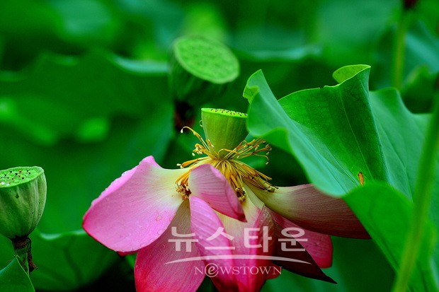 비를 맞은 연꽃은 커다란잎사귀에 축 늘어진다.