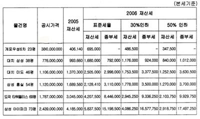 그러나 이번 재산세 탄력세율 50%가 적용되면 대치동 삼성 38평 아파트는 재산세 84만 원과 종부세 101만2천 원으로 62만 원의 세금감면 혜택을 보게 된다. 반면 재산세 탄력세율 30%가 적용되면 재산세 117만6천 원과 종부세 92만4천 원으로 세금감면액이 37만2천 원으로 줄게 된다.(표 참조)