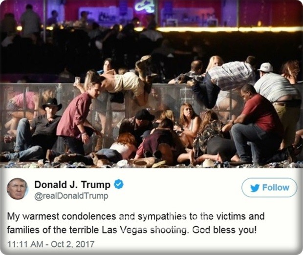 한편 도널드 트럼프 대통령은 2일 오전 트위터를 통해 끔찍한 라스베이거스 총기 사건으로 인한 피해자와 유족들에 조의를 표했다. 라스베이거스는 카지노와 나이트클럽, 쇼핑몰 등으로 유명한 도시로, 전 세계에서 매년 350만 명이 관광 목적으로 방문하는 유명한 관광지이다.