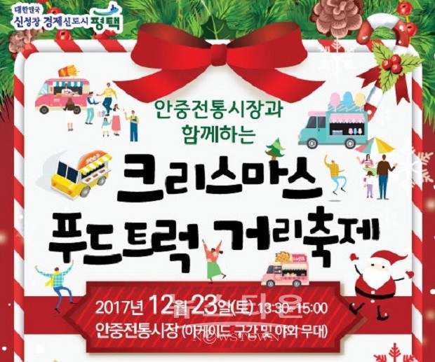 오는 12월 4일 월요일 안중시장고객센터앞 『크리스마스트리』설치를 비롯해 12월 한달간 금 ․ 토 ․ 일요일에 푸드트럭 거리축제가 열림과 동시에 오후 5시부터는 버스킹공연으로 한층 열기를 북돋아 안중전통시장이 먹거리와 볼거리가 있는 활기찬 골목시장으로 거듭나게 된다.