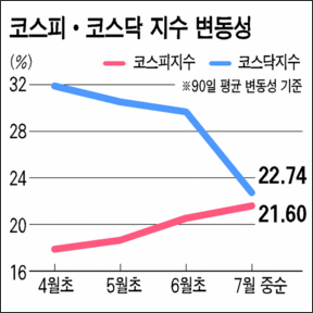 반면 코스닥지수 변동성 값은 4월 31% 였던 것이 6월엔 29%, 그리고 이달에는 22%대까지 크게 줄었다.