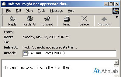 개인 정보를 유출하는 신종 웜 'Fizzer(Win32/Fizzer.worm)'가 국내에 상륙 신속히 전파되고 있다. 이 웜은 다양한 전파 경로를 가지고 있고 또한 메일로 전파될 때 아래와 같이 다양한 제목과 본문을 가지고 있다.