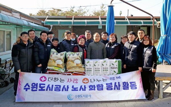 수원도시공사가 연말연시를 맞아 소외계층에게 봉사활동과 생필품을 전하며 온기를 나누고 있다.
